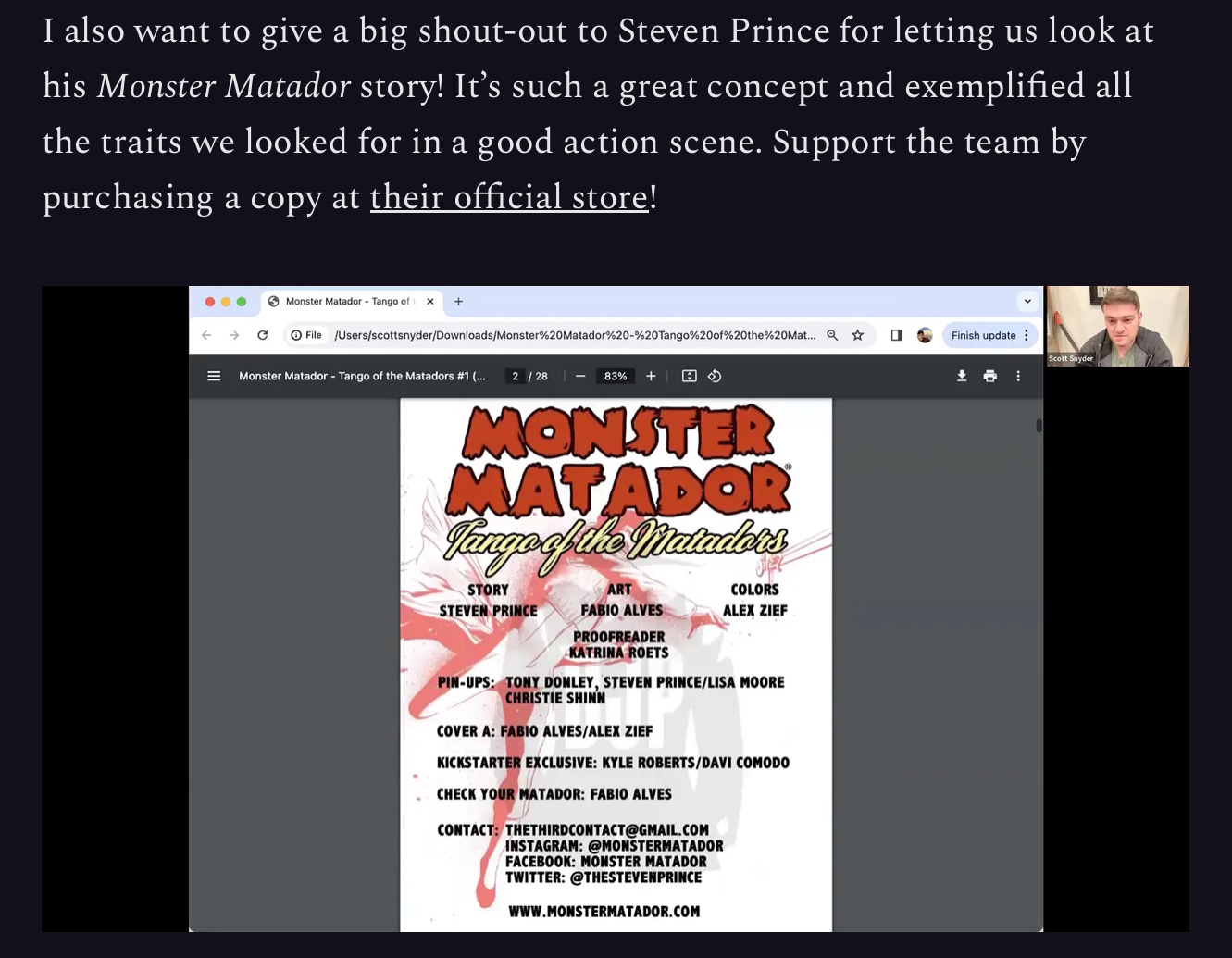 If you’re not subscribed to Scott Snyder’s substack, I highly recommend it. There are paid and free tiers, but the best part is both tiers give you access to his comic writing classes. His most recent class, ACTION SCENES takes a look at Monster Matador: Tango of the Matadors #1 as an example of a well done action scene. Pretty cool. You can subscribe for FREE here.